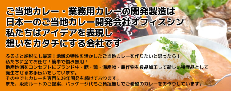 ブランド牛・豚・鶏、海産物、農作物を使用して地域の活性化の一助としてご当地カレーを開発します。また、弊社の販路でも販売のお手伝いを致しますので賞味期限に悩む事は御座いません。